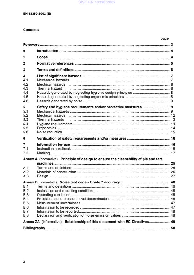 EN 13390:2002 is a standard published by the European Committee for Standardization (CEN). Its full title is "Food processing machinery - Pie and tart machines - Safety and hygiene requirements". This standard covers: This standard specifies safety and hygienic design requirements for the manufacture of machines used for the production of pies, tarts, pasties, en croute products and other similar items where the pastry cases are formed by the closing under pressure of one or more forming heads. The standard applies to the following three basic types of machine : - machines where operators hands enter hazard zone 1 (see 4.1) at each cycle ; - machines which are loaded outside hazard zone 1 ; - automatic machines. Figure 1, 2 and 3 illustrate examples of these. Automatic loading devices are not covered by this standard. This standard applies to electrically, pneumatically and hydraulically powered machines. Manually operated machines are excluded from the scope of this standard. Clause 4 lists the significant hazards identified on these machines on the basis of a risk assessment carried out following the principles in EN 1050 : 1996. The safety and hygiene requirements take into account the hazards arising from use (including setting, process changeover, operation), cleaning and maintenance. Hazards arising from foreseeable misuse (3.12, EN 292-1 : 1991) are also included. Flour dust is not a significant hazard at pie and tart machines. A noise test code is included in Annex B to assist manufacturers to measure noise level for the purpose of the noise emission declaration. This document in not applicable to pie and tart machines which are manufactured before the date of publication of this document by CEN.