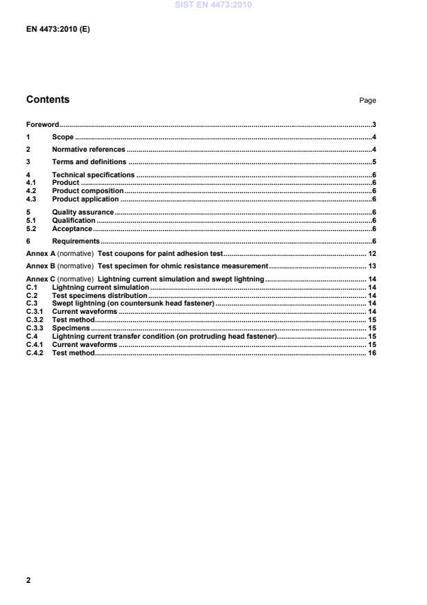 Lightning current simulation and swept lightning . 14C.1 Lightning current simulation . 14C.2 Test specimens distribution . 14C.3 Swept lightning (on countersunk head fastener) . 14C.3.1 Current waveforms . 14C.3.2 Test method . 15C.3.3 Specimens . 15C.4 Lightning current transfer condition (on protruding head fastener) . 15C.4.1 Current waveforms . 15C.4.2 Test method . 16 SIST EN 4473:2010