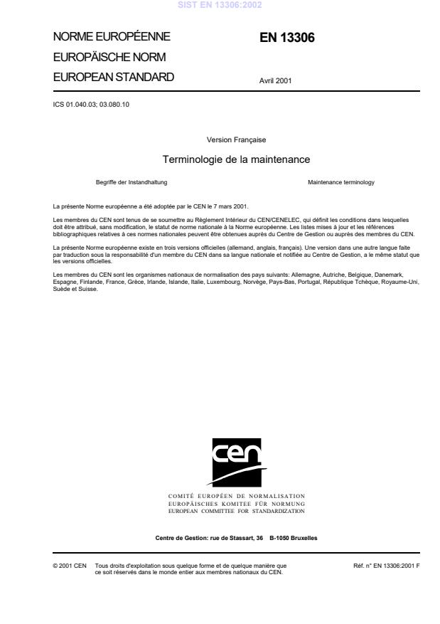 B-1050 Brussels© 2001 CENAll rights of exploitation in any form and by any means reservedworldwide for CEN national Members.Ref. No. EN 13306:2001 ESIST EN 13306:2002
