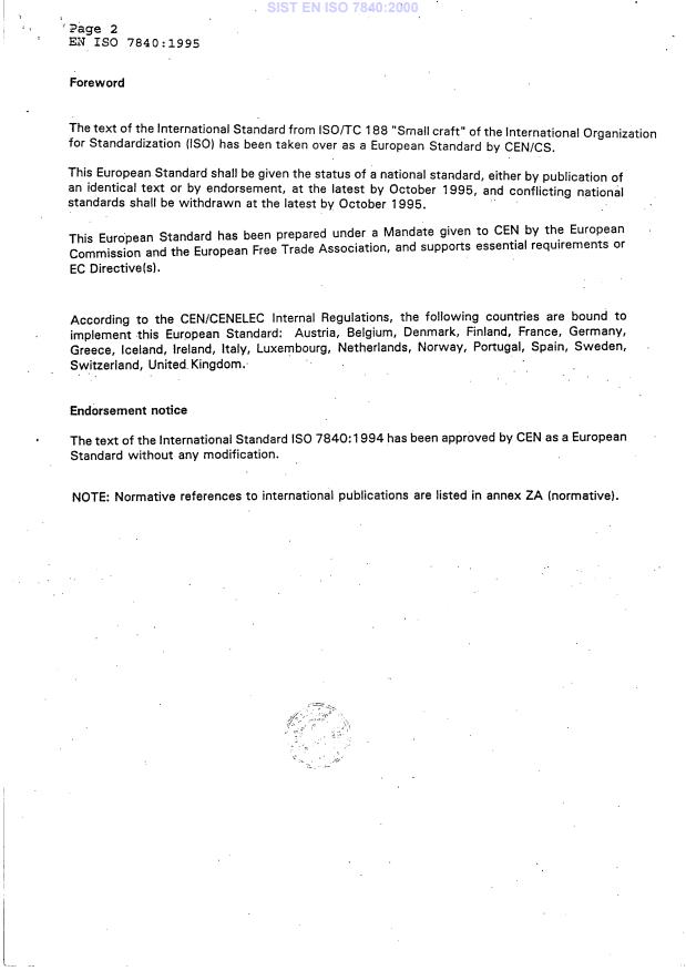 EN ISO 7840:1995 is associated with the following European legislation: EU Directives/Regulations: 94/25/EC; Standardization Mandates: M/075. When a standard is cited in the Official Journal of the European Union, products manufactured in conformity with it benefit from a presumption of conformity with the essential requirements of the corresponding EU directive or regulation.