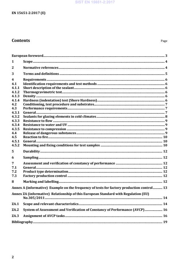 European foreword . 3 1 Scope . 4 2 Normative references . 4 3 Terms and definitions . 5 4 Requirements . 6 4.1 Identification requirements and test methods . 6 4.1.1 Short description of the sealant . 6 4.1.2 Thermogravimetric test. 6 4.1.3 Density . 6 4.1.4 Hardness (indentation) test (Shore Hardness) . 6 4.2 Conditioning, test procedure and substrates . 7 4.3 Performance requirements . 7 4.3.1 General . 7 4.3.2 Sealants for glazing elements in cold climates . 8 4.3.3 Resistance to flow . 9 4.3.4 Resistance to water and UV . 9 4.3.5 Resistance to compression . 9 4.4 Release of dangerous substances . 9 4.5 Reaction to fire . 10 4.5.1 General . 10 4.5.2 Mounting and fixing conditions for test samples . 10 5 Durability . 12 6 Sampling . 12 7 Assessment and verification of constancy of performance . 12 7.1 General . 12 7.2 Product type determination . 12 7.3 Factory production control . 12 8 Marking and labelling . 12 Annex A (informative)