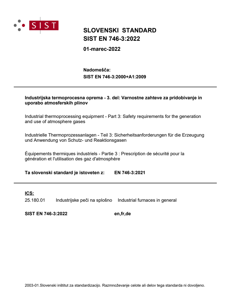 Ta del skupine standardov EN 746 določa varnostne zahteve za proizvodnjo in uporabo zaščitnih in reaktivnih atmosferskih plinov, ki so del industrijske opreme za termoprocesiranje (TPE).