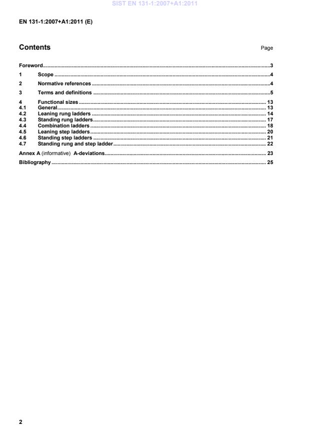 Page Foreword .31Scope .42Normative references .43Terms and definitions .54Functional sizes . 134.1General . 134.2Leaning rung ladders . 144.3Standing rung ladders . 174.4Combination ladders . 184.5Leaning step ladders . 204.6Standing step ladders . 214.7Standing rung and step ladder . 22Annex A (informative)