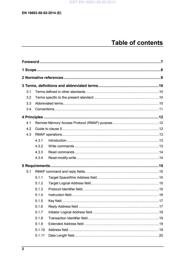 2 Table of contents Foreword . 7 1 Scope . 8 2 Normative references . 9 3 Terms, definitions and abbreviated terms . 10 3.1 Terms defined in other standards . 10 3.2 Terms specific to the present standard . 10 3.3 Abbreviated terms. 10 3.4 Conventions. 11 4 Principles . 12 4.1 Remote Memory Access Protocol (RMAP) purpose . 12 4.2 Guide to clause 5 . 12 4.3 RMAP operations. 13 4.3.1 Introduction . 13 4.3.2 Write commands . 13 4.3.3 Read commands . 14 4.3.4 Read-modify-write . 14 5 Requirements . 15 5.1 RMAP command and reply fields . 15 5.1.1 Target SpaceWire Address field . 15 5.1.2 Target Logical Address field . 15 5.1.3 Protocol Identifier field . 15 5.1.4 Instruction field . 16 5.1.5 Key field . 17 5.1.6 Reply Address field . 17 5.1.7 Initiator Logical Address field . 19 5.1.8 Transaction Identifier field . 19 5.1.9 Extended Address field . 19 5.1.10 Address field . 19 5.1.11 Data Length field . 20 SIST EN 16603-50-52:2014