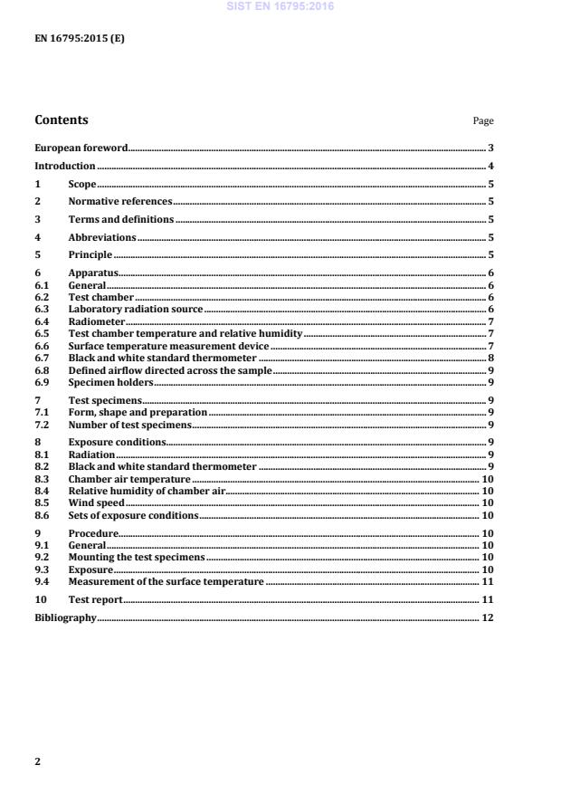 EN 16795:2015 is a standard published by the European Committee for Standardization (CEN). Its full title is "Plastics - Method for estimating heat build up of flat surfaces by simulated solar radiation". This standard covers: This European Standard specifies a method for estimating the temperature increase of a flat polymer surface, due to its solar radiant energy absorption, compared to the ambient temperature. For that purpose, a specimen and black and white reference plates are exposed to simulated solar radiation under specified conditions (simulated solar radiation, ambient air temperature, convective flow). For opaque specimens, a thermally sensitive electrical element at the backside or a pyrometer is used to measure the surface temperature. For translucent specimens, a pyrometer is used to measure surface temperature. NOTE Some specific polymeric materials are translucent (transparent) and might have a transmittance window in a wavelength range where the used pyrometer is sensitive (e.g. polyethylene). The surface temperature of these materials cannot be measured with the contact and the contactless method.