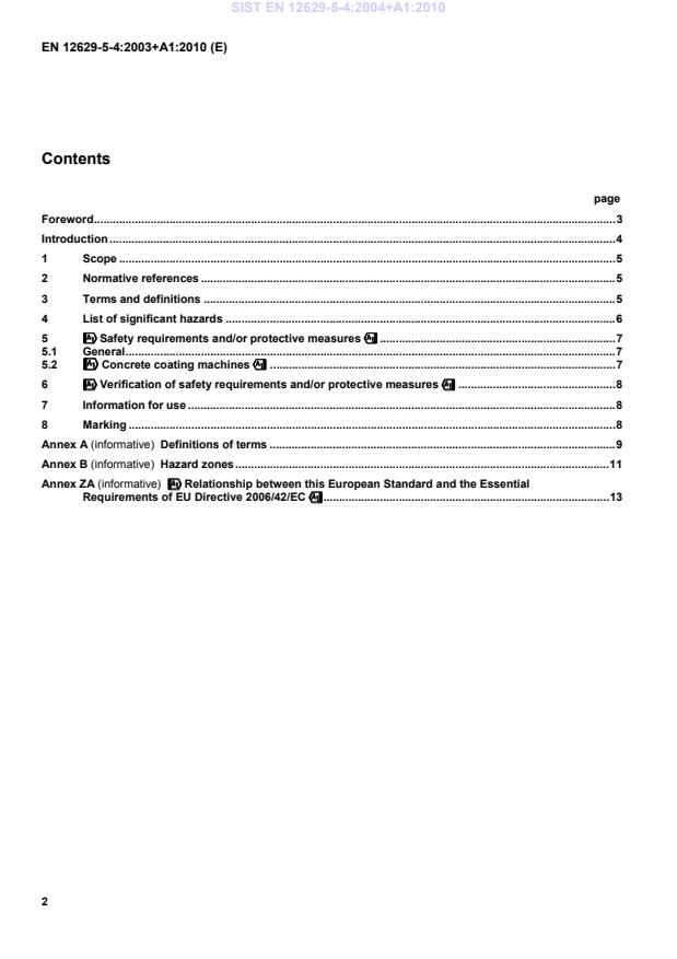 Contents page Foreword . 3Introduction . 41Scope . 52Normative references . 53Terms and definitions . 54List of significant hazards . 65!!!!Safety requirements and/or protective measures"""" . 75.1General . 75.2!!!!Concrete coating machines"""" . 76!!!!Verification of safety requirements and/or protective measures"""" . 87Information for use . 88Marking . 8Annex A (informative)