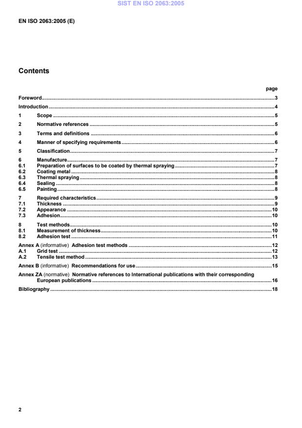 page Foreword.3 Introduction.4 1 Scope.5 2 Normative references.5 3 Terms and definitions.6 4 Manner of specifying requirements.6 5 Classification.7 6 Manufacture.7 6.1 Preparation of surfaces to be coated by thermal spraying.7 6.2 Coating metal.8 6.3 Thermal spraying.8 6.4 Sealing.8 6.5 Painting.8 7 Required characteristics.9 7.1 Thickness.9 7.2 Appearance.10 7.3 Adhesion.10 8 Test methods.10 8.1 Measurement of thickness.10 8.2 Adhesion test.11 Annex A (informative)