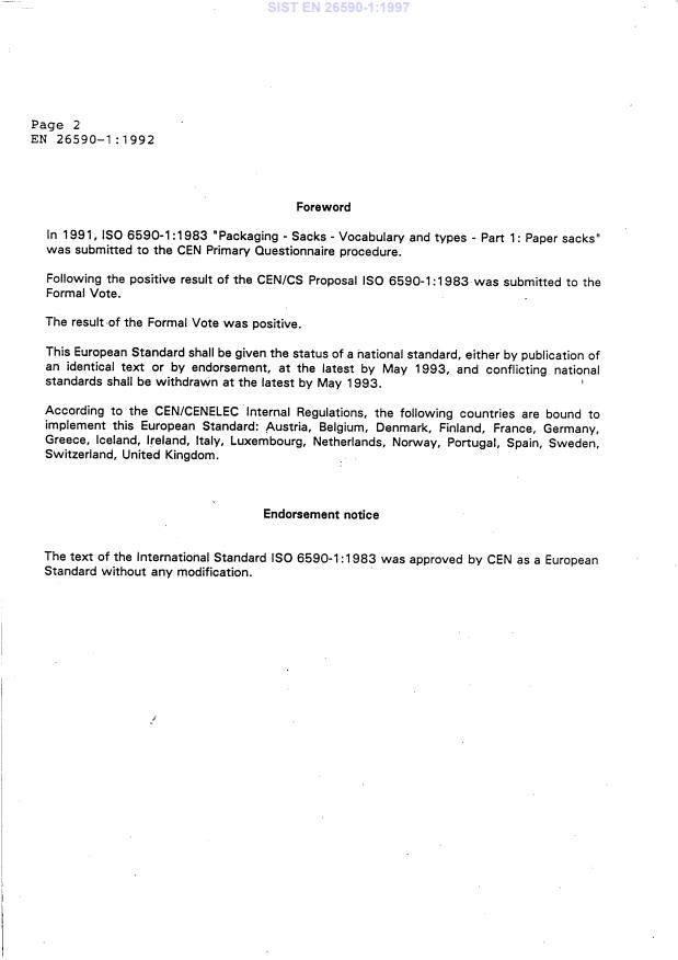 EN 26590-1:1992 is a standard published by the European Committee for Standardization (CEN). Its full title is "Packaging - Sacks - Vocabulary and types - Part 1: Paper sacks (ISO 6590-1:1983)". This standard covers: This part of ISO 6590 defines terms commonly used in paper sack manufacture. It refers to single- and multi-ply sacks made from paper; it does not refer to bags for the retail trade. It specifies types of sacks, constructional details, materials and describes parts of a sack. It delivers alphabetical indices in three languages.