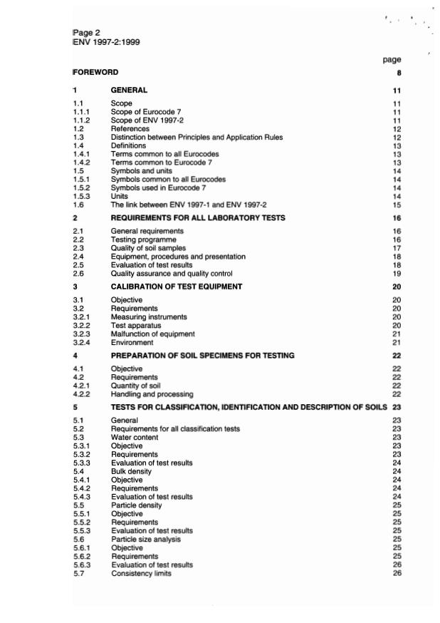 ENV 1997-2:1999 is a standardization document published by the European Committee for Standardization (CEN). Its full title is "Eurocode 7: Geotechnical design - Part 2: Design assisted by laboratory testing". This standard covers: Eurocode 7 applies to the geotechnical aspects of the design of buildings and civil engineering works. It is subdivided into various separate parts. See 1.1.2. Eurocode 7 is concerned with the requirements for strength, stability, serviceability and durability of the structures. Other requirements, e.g. concerning thermal or sound insulation, are not considered.