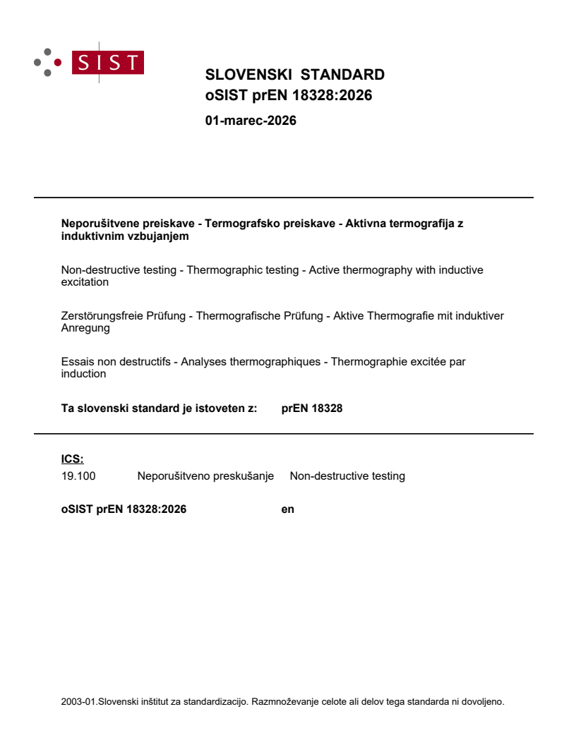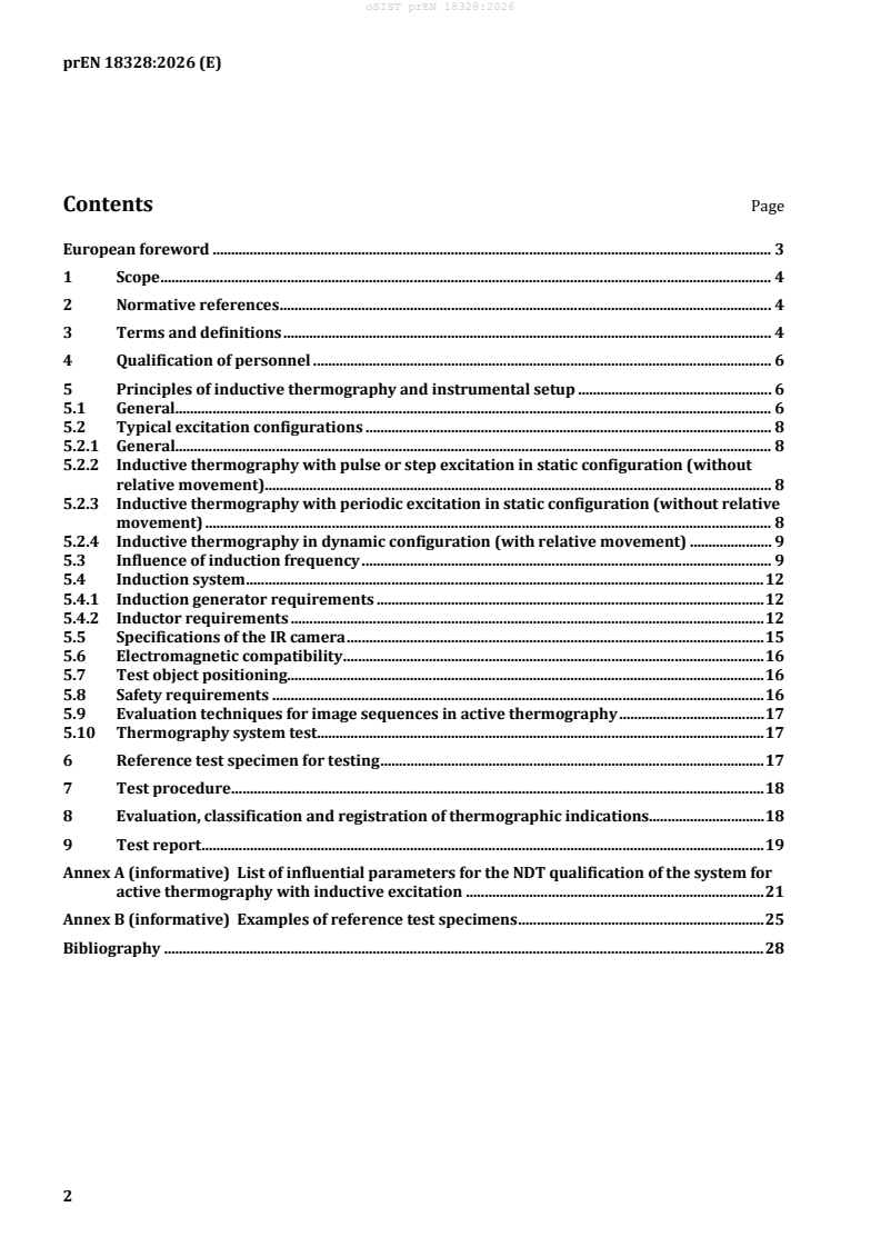 prEN 18328 is a draft published by the European Committee for Standardization (CEN). Its full title is "Non-destructive testing - Thermographic testing - Active thermography with inductive excitation". This standard covers: This document specifies a method and establishes guidelines for non-destructive testing using active thermography with inductive excitation. By using inductive heating of the test object, this active thermography method is suitable for inspecting test objects made of metals or other electrically conductive materials. Such tests are conducted for: - the detection of surface-breaking discontinuities, particularly cracks; and - the detection of discontinuities located near the surface. The functional principle of the defect detection can be based on a direct interaction of defect and excitation signal (defect selective) or an indirect interaction by using derivations of the applied heat flow. For this purpose, active thermography with inductive excitation is conducted using different sources of excitation (inductors) in reflection and transmission configurations. Areas tested in one shot are typically between a few cm2 and a few hundred cm2, depending on the geometry of the used inductor. In dynamic configuration, larger areas can be tested. Fields of application for active thermography with inductive excitation are to be found in industrial manufacturing and in maintenance (vehicle, drive system and power plant components, jointing technique, semi-finished products, etc.). Active thermography with inductive excitation is also called inductive thermography or eddy-current excited thermography.