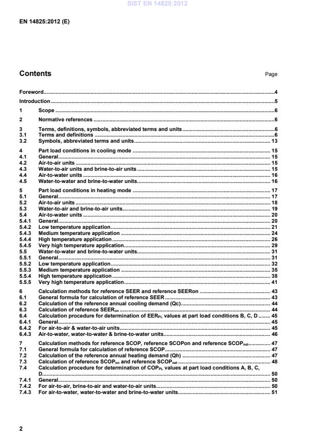 Ta evropski standard se nanaša na klimatske naprave, toplotne črpalke in enote za tekočinsko hlajenje. Uporablja se za tovarniško izdelane enote, določene v standardu EN 14511-1:2011, razen za enote z enim vodom, enote s stikalno omarico in enote za neposredni nadzor. V tem evropskem standardu so navedene metode za izračun referenčne sezonske energetske učinkovitosti SEER in SEERon ter referenčnih sezonskih koeficientov učinkovitosti SCOP, SCOPon in SCOPnet. Takšne metode izračuna lahko temeljijo na izračunanih ali izmerjenih vrednostih. V primeru izmerjenih vrednosti ta evropski standard zajema preskusne metode za določanje zmogljivosti, vrednosti EER in COP med aktivnim delovanjem ob delnih obremenitvenih pogojih. Prav tako zajema preskusne metode za porabo električne energije enote ob izključenem termostatu, v stanju pripravljenosti in v načinu grelnika ohišja med sezono hlajenja. Ta evropski standard se uporablja za vhodne podatke za izračun sistemske energetske učinkovitosti v načinu ogrevanja, in sicer za posebne sisteme toplotnih črpalk v stavbah, kot določa standard EN 15316-4-2.