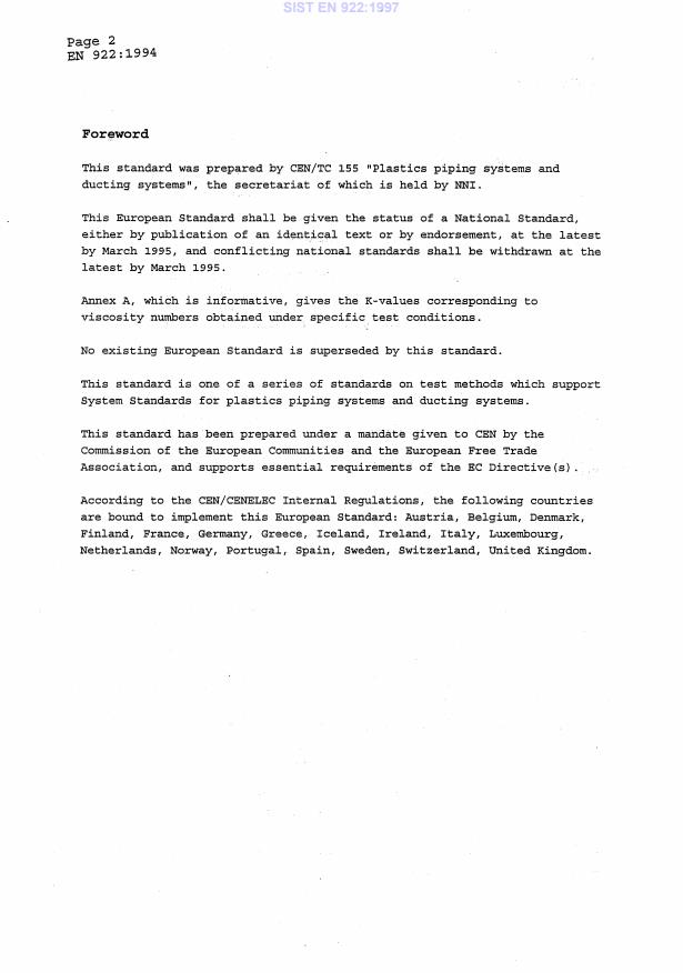 EN 922:1994 is a standard published by the European Committee for Standardization (CEN). Its full title is "Plastics piping and ducting systems - Pipes and fittings of unplasticized poly(vinyl chloride) (PVC-U) - Specimen preparation for determination of the viscosity number and calculation of the K-value". This standard covers: This Standard specifies a method for determining the viscosity number and K-value of a PVC-resin derived from a pipe, fitting or compound. In this standard, only the method for isolation of the PVC-resin is detailed, while for the determination of viscosity number reference is made to ISO 174. An equation for the calculation of K-value (according to Fikentscher) from viscosity data is given (K-values corresponding to a series of viscosity numbers for PVC resin are given for information in annex A). The presence of other polymers may invalidate the method (see clause 3).