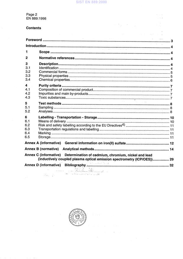 EN 889:1998 is a standard published by the European Committee for Standardization (CEN). Its full title is "Chemicals used for treatment of water intended for human consumption - Iron (II) sulfate". This standard covers: This European Standard is applicable to iron(II) sulfate heptahydrate used for treatment of water intended for human consumption. It describes the characteristics of iron (II) sulfate heptahydrate and specifies the requirements and the corresponding analytical methods for iron (II) sulfate heptahydrate and gives information on its use in water treatment.