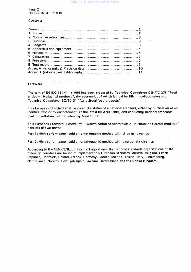 EN ISO 15141-1:1998 is a standard published by the European Committee for Standardization (CEN). Its full title is "Foodstuffs - Determination of ochratoxin A in cereals and cereal products - Part 1: High performance liquid chromatographic method with silica gel clean up (ISO 15141-1:1998)". This standard covers: This European Standard specifies a method for the determination of ochratoxin A of greater than 0,4 ug/kg. The method has been successfully validated in 2 interlaboratory studies according to ISO 5725:1996 (1) on wheat whole meal containing 0,4 microgramme/kg and 1,2 microgramme/kg of ochratoxin A. Note: Numerous laboratory experiences have shown that this method is also applicable to cereals, dried fruits, oilseeds, pulses, wine, beer, fruit juices and raw coffee, see (2), (3), (4).