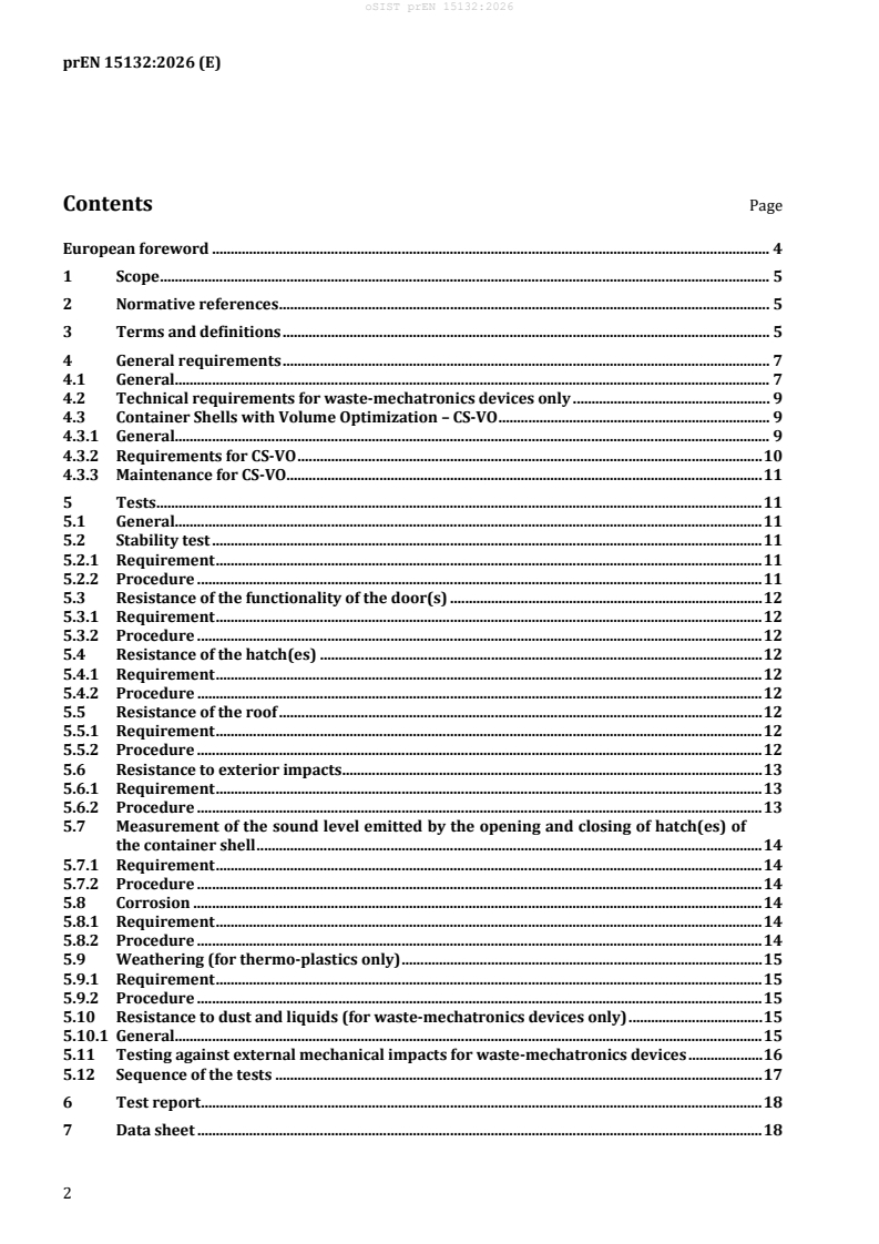 prEN 15132 is a draft European Standard developed by CEN, specifying the performance requirements and test methods for container shells designed for mobile waste containers up to a capacity of 1,700 liters. These container shells house the waste containers and serve as essential street furniture for efficient and hygienic waste collection. The standard applies to containers covered by EN 840-1 to EN 840-4 and introduces advanced features such as volume optimization (CS-VO) and waste-mechatronics devices, supporting modern urban waste management needs.