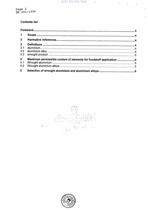 EN 602:1994 is a standard published by the European Committee for Standardization (CEN). Its full title is "Aluminium and aluminium alloys - Wrought products - Chemical composition of semi products used for the fabrication of articles for use in contact with food". This standard covers: This European Standard specifies the maximum percentage content of alloying elements and impurities present in wrought aluminium and aluminium alloys which are fabricated into materials and articles designed to be in contact with food.