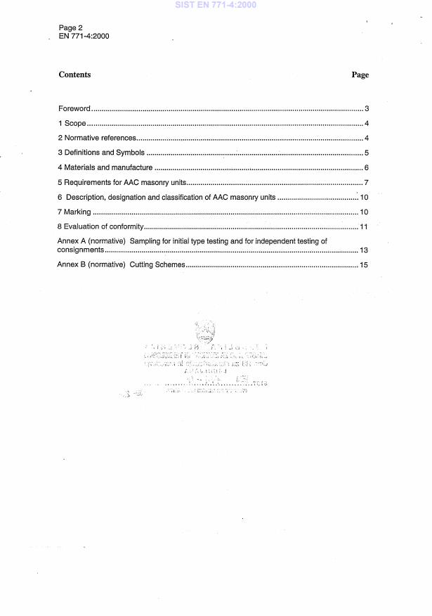 EN 771-4:2000 is a standard published by the European Committee for Standardization (CEN). Its full title is "Specification for masonry units - Part 4: Autoclaved aerated concrete masonry units". This standard covers: This European Standard specifies the characteristics and performance requirements of autoclaved aerated concrete (AAC) masonry units for which the main intended uses are different types of loadbearing and non-loadbearing applications in all forms of walling including single leaf, cavity, partitions, retaining, basement and general use below ground level, including walling for fire protection, thermal insulation, sound insulation and chimneys.