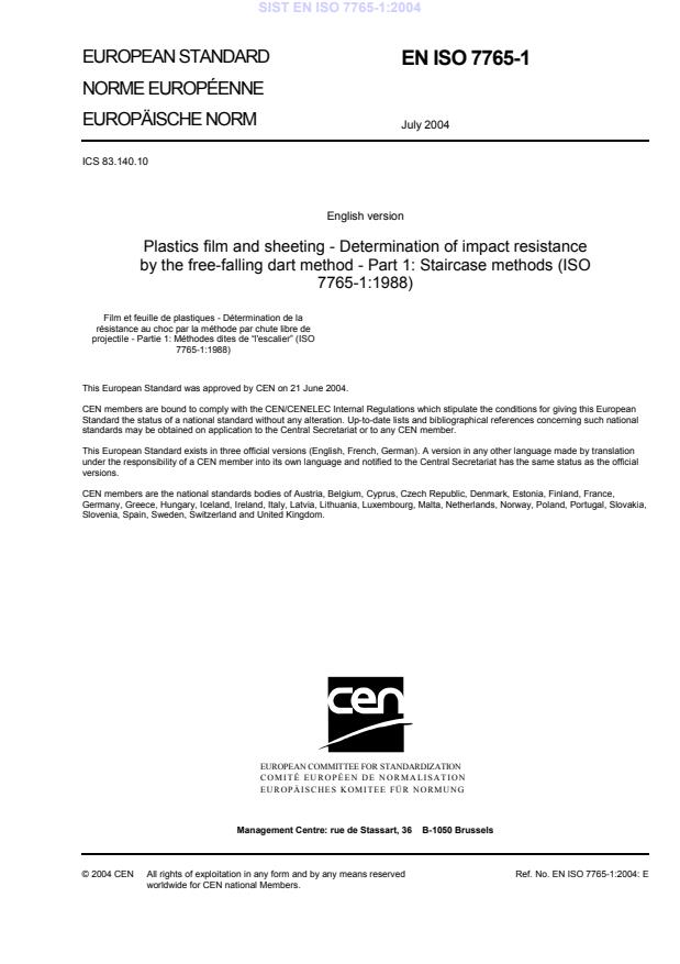 EN ISO 7765-1:2004 is a standard published by the European Committee for Standardization (CEN). Its full title is "Plastics film and sheeting - Determination of impact resistance by the free-falling dart method - Part 1: Staircase methods (ISO 7765-1:1988)". This standard covers: Specifies methods for the determination of the energy, that causes plastics films and sheet less than 1 mm in thickness to fail under specified conditions of impact of a free falling dart from a specified height, tha would result in failure of 50 % of the specimes tested. Two methods are described. Method A employs a dart with 38 mm diameter hemispherical head, dropped from a height of 0,66 m, and method B employs a dart with a 50 mm diameter hemispherical head dropped from a height of 1,50 m. The measurement technique is the stairecase method.