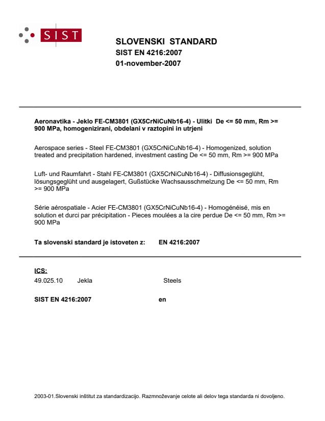 2003-01.Slovenski inštitut za standardizacijo. Razmnoževanje celote ali delov tega standarda ni dovoljeno.Aerospace series - Steel FE-CM3801 (GX5CrNiCuNb16-4) - Homogenized, solution treated and precipitation hardened, investment casting De <= 50 mm, Rm >= 900 MPaAeronavtika - Jeklo FE-CM3801 (GX5CrNiCuNb16-4) - Ulitki