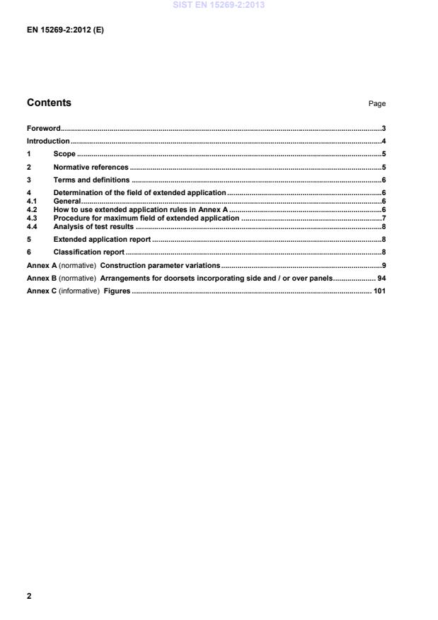 4.1 General 4.1.1 Before there can be any consideration for extended application, a representative doorset shall have been tested and classified in accordance with EN1634-1 and EN 13501-2 respectively in order to establish a classification for the doorset. 4.1.2 A review of the doorset construction parameters can indicate that one or more characteristics may be improved by a particular parameter variation. All evaluations shall be made on the basis of retaining the classifications obtainable from testing to EN 1634-1, including those lower than the test duration. However, this shall never lead to an increased classification for any specific parameter beyond that achieved during any one test unless specifically identified in the relevant Construction Parameter Variation tables. 4.1.3 If, when following the extended application procedure, any part of the classified product cannot be covered by the extended application rules, that part shall be omitted from the subsequent extended application report and classification report. 4.2 How to use extended application rules in Annex A 4.2.1 Identify the variations from the original test specimen(s) which are required to be covered by an extended application report. 4.2.2 Locate the variations in the appropriate parameter variation by reference to columns (1) and (2) of Annex A. SIST EN 15269-2:2013