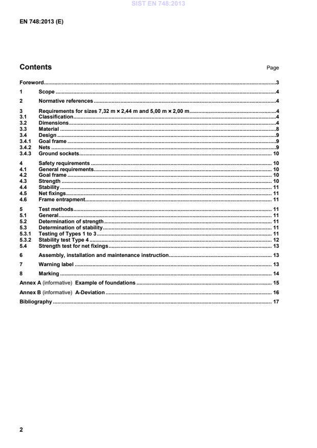EN 748:2013 is a standard published by the European Committee for Standardization (CEN). Its full title is "Playing field equipment - Football goals - Functional and safety requirements, test methods". This standard covers: This document specifies the functional requirements for 4 types and 2 sizes (see Clause 3) and the safety require¬ments (see Clause 4) for football goals. It is applicable to football goals for training and competition in outdoor sports facilities and indoor arenas.