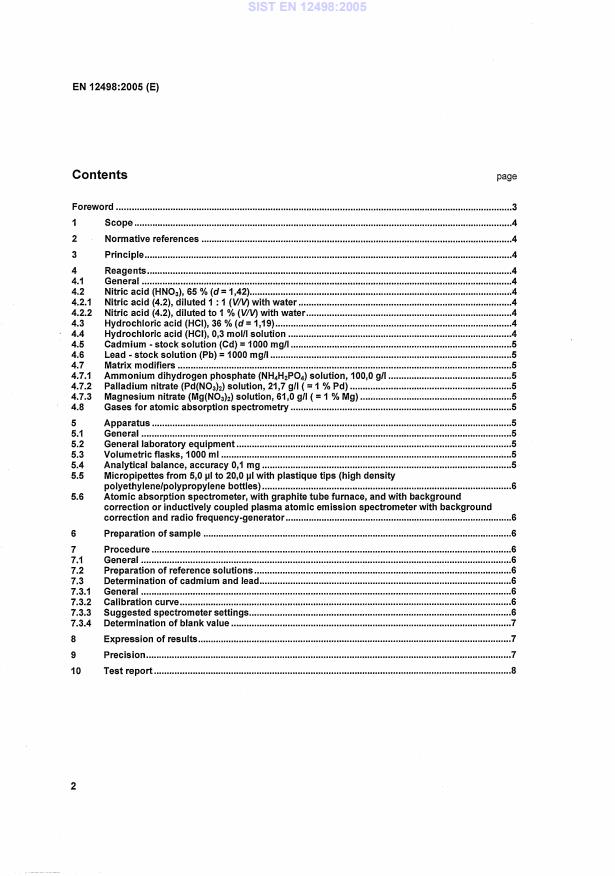 EN 12498:2005 is a standard published by the European Committee for Standardization (CEN). Its full title is "Paper and board - Paper and board intended to come into contact with foodstuffs - Determination of cadmium and lead in an aqueous extract". This standard covers: This European Standard is one in a series of Standards for the determination of heavy metals in an aqueous extract of paper or board intended for contact with food. This European Standard specifies the test method for the determination of cadmium and lead in an aqueous extract. It is applicable to paper and paperboard with extractable metal contents exceeding - 0,1 mg per kg for cadmium; - 0,6 mg per kg for lead. NOTE 1 The above limits of determination are achieved by multiplying the actual limits existing today or proposed in Europe by 0,2. NOTE 2 Metal content levels below those given can be measured by this European Standard if very sensitive equipment is available and if all other laboratory conditions fulfil the requirements for trace element analysis.