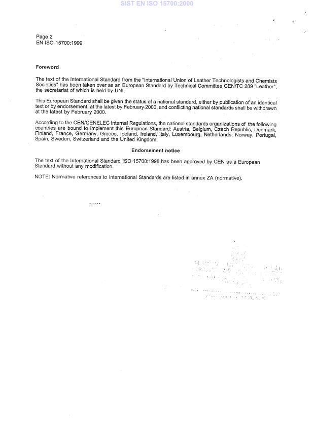 EN ISO 15700:1999 (ISO 15700:1998) specifies a standardized method for evaluating colour fastness to water spotting on leather. Prepared by the IULTCS Fastness Tests Commission and adopted by CEN, the standard describes how small water droplets affect the appearance and colour of leather surfaces, including a specific procedure for patent and plastic-coated leathers. It is used to assess both immediate physical effects (swelling, loss of lustre) and residual colour change using the standard grey scale.