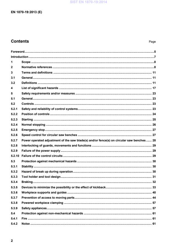 EN 1870-19:2013 is a standard published by the European Committee for Standardization (CEN). Its full title is "Safety of woodworking machines - Circular sawing machines - Part 19: Circular saw benches (with and without sliding table) and building site saws". This standard covers: This European Standard deals with all significant hazards, hazardous situations and events as listed in Clause 4 which are relevant to stationary and displaceable circular saw benches (with or without sliding table and/or demountable power feed unit) and building site saws, hereinafter referred to as "machines", designed to cut solid wood, chipboard, fibreboard, plywood and also these materials, if they are covered with plastic edging and/or plastic/light alloy laminates, when they are used as intended and under the conditions foreseen by the manufacturer including reasonably foreseeable misuse. Machines which are designed to cut wood-based material may also be used for cutting hardened plastic materials with similar physical characteristics as wood. NOTE 1 For the definition of stationary and displaceable machine see 3.2.9 and 3.2.10. NOTE 2 Circular saw benches are used for ripping, cross cutting, dimensioning and grooving. Building site saws are used for ripping, cross cutting and dimensioning. The requirements of this document apply also to machines designed for grooving with a width not exceeding 20 mm in one pass by using a milling tool. This document does not apply to: a) machines set up on a bench or a table similar to a bench, which are intended to carry out work in a stationary position, capable of being lifted by one person by hand. The bench can also be an integrated part of the machine if it consists of hinged legs which can be extended down; b) hand held woodworking machines including any adaptation permitting their use in a different mode, i.e. bench mounting. NOTE 3 Transportable motor-operated electric tools are covered by the requirements of EN 61029-1:2009 together with EN 61029-2-1:2012; a hand-held motor-operated electric tool and a saw bench to form an integrated whole are covered by EN 60745-1:2009 together with EN 60745-2-5: 2010. For the purpose of this document, building site saws having a tiltable spindle are considered to be circular saw benches. This document is not applicable to circular saw benches (with and without sliding table) and building site saws which are manufactured before the date of its publication as EN. NOTE 4 Machines covered by this document are listed under 1.1 of Annex IV of the Machinery Directive.