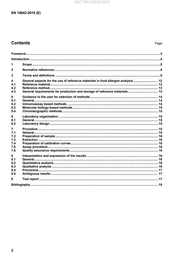 Ta evropski standard opredeljuje, kako uporabljati standarde za imunske preskuse, metode na osnovi nukleinskih kislin inkromatografije in njihovo razmerje v analizi alergenov v živilih. Vsebuje splošne definicije, zahteve in smernice za postavitev laboratorija, zahteve za validacijo metode, opis metod in poročila o preskusih. Ta dokument tudi opredeljuje splošne smernice za zahteve in uporabo referenčnih materialov za določevanje alergenih proizvodov v živilskih proizvodih. Izraz "referenčni materiali" v tem dokumentu zajema certificirane referenčne materiale, kot tudi materiale za nadzor kakovosti. Trenutno je na voljo le omejeno število referenčnih materialov za določevanje alergenov v živilih. Ko bodo novi materiali sprejeti in validirani, so lahko dodani temu dokumentu kot Dodatek. Ta dokument ne obravnava vprašanj v zvezi z vzorčenjem. Podrobno navaja samo postopke od sprejema laboratorijskega vzorca do končnega rezultata.
