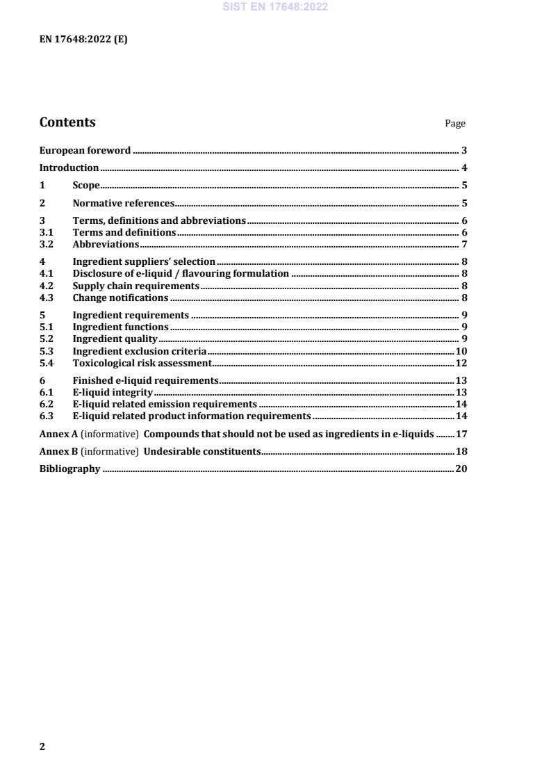 EN 17648:2022 is a standard published by the European Committee for Standardization (CEN). Its full title is "E-liquid ingredients". This standard covers: This document describes requirements related to ingredients used in e-liquids and e-liquid components. This document: - specifies ingredient purity and related supply chain requirements; - specifies ingredient exclusion criteria based on function and toxicological properties; - specifies the need for a toxicological risk assessment and provides guidance on the content of this as well as specifying competency requirements for those responsible for it; - specifies nicotine content versus label claim over shelf life and performance characteristics of the analytical method used to measure the nicotine; - specifies pH limits for the e-liquid; - provides guidance on the measuring of emissions; - specifies certain ingredient-related product labelling; - provides guidance on ingredients that should not be used in e-liquids; - provides guidance on maximum levels in finished e-liquid for certain undesirable constituents that may occur in natural extracts used as flavourings. This document does not apply to packaging, vaping devices or refill container materials/ingredients.