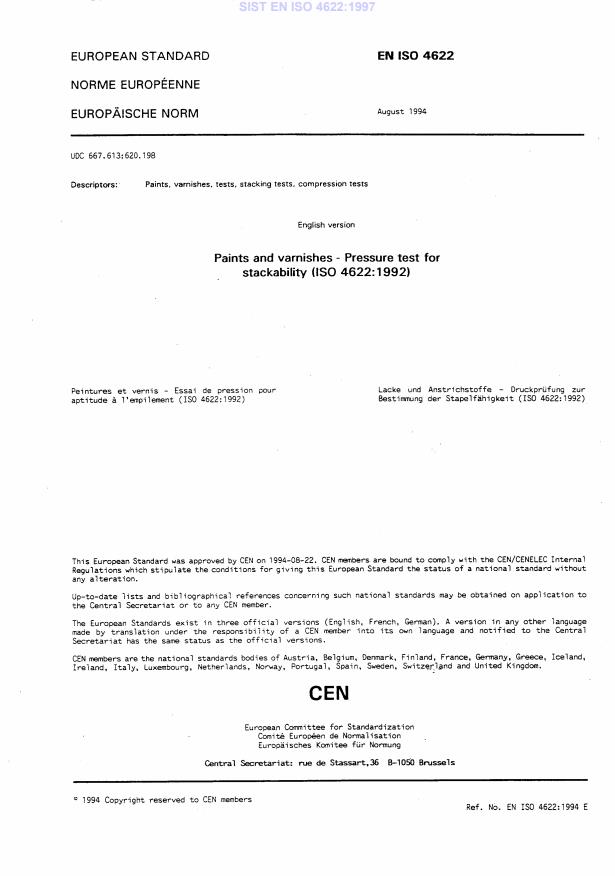 EN ISO 4622:1994 is a standard published by the European Committee for Standardization (CEN). Its full title is "Paints and varnishes - Pressure test for stackability (ISO 4622:1992)". This standard covers: This international standard specifies a test method for determining, under standard conditions, whether a single-coat film or a multi-coat system of paints or related materials after a specified drying period is sufficiently dry to resist damage when two painted surfaces or one painted surface and another surface are placed in contact under pressure.