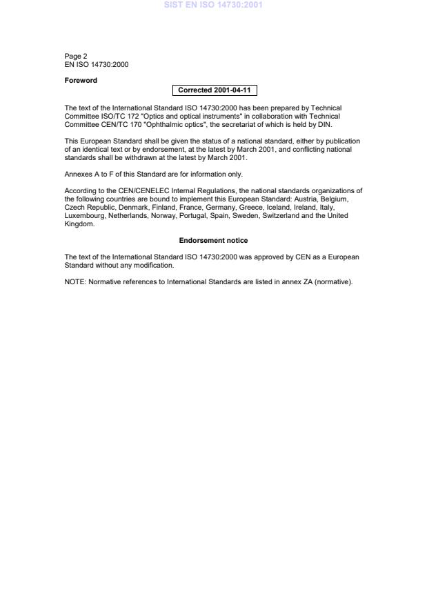 EN ISO 14730:2000 is classified under the following ICS (International Classification for Standards) categories: 11.040.70 - Ophthalmic equipment. The ICS classification helps identify the subject area and facilitates finding related standards.