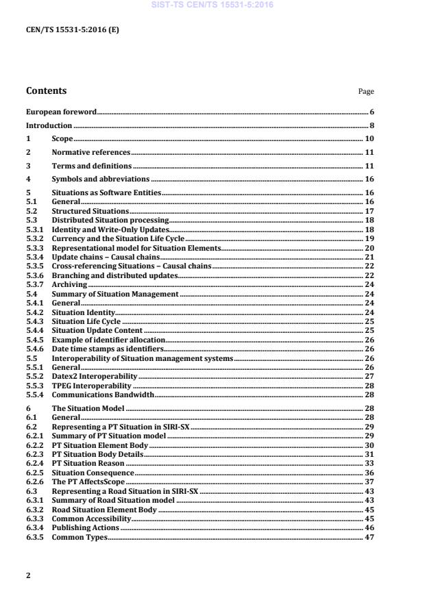 CEN/TS 15531-5:2016 is a technical specification published by the European Committee for Standardization (CEN). Its full title is "Public transport ‐ Service interface for real‐time information relating to public transport operations ‐ Part 5: Functional service interfaces situation exchange: Situation Exchange". This standard covers: The scope of this WI is to update CEN/TS 15531-5:2011 which describes structured incident model for disruptions to services, in terms that relate directly to the entities of other SIRI services. Incidents can then be directly linked to stops, lines, journeys, etc in two ways: as the cause of disruption or as the result of service problems. The Incident Monitoring Service is capable of filtering on incident, service and location model attributes. First implementations of the Situation Exchange Service have revealed a number of improvements and some minor enhancements necessary for a successful and uniform usage of the specification in the future. The main elements out of this work item will be: o Prepare an updated edition of the TS as a document o Update the common XSD of SIRI parts 1-5 The new work item will consider the work of o PT companies and IT-suppliers in Germany o PT companies and IT-suppliers in France o PT companies and IT-suppliers in Sweden using Situation Exchange Service in their projects.