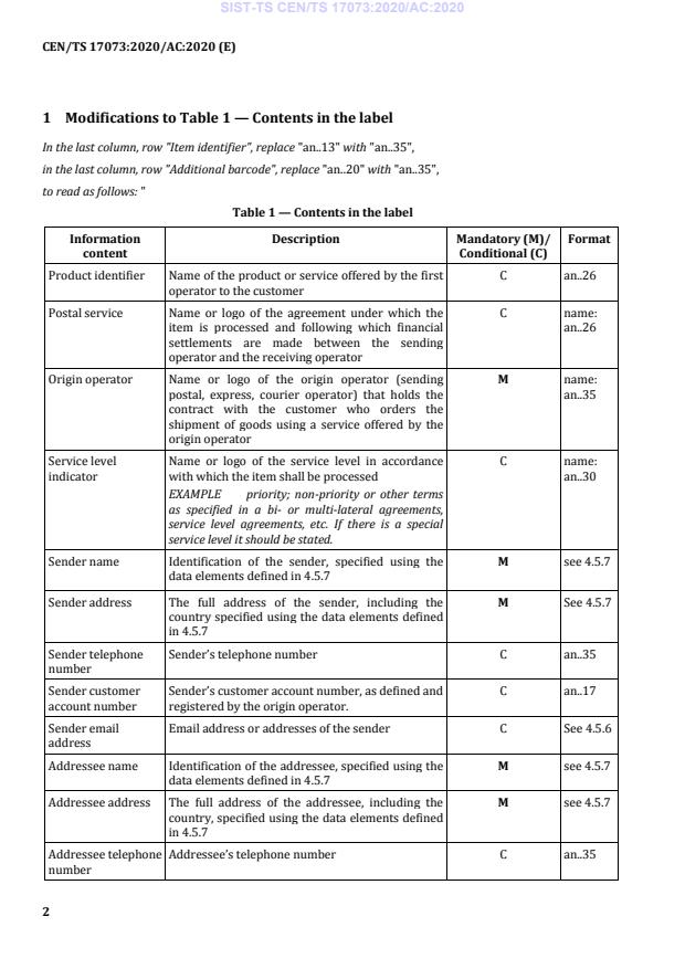 CEN/TS 17073:2020/AC:2020 is a corrigendum published by the European Committee for Standardization (CEN). Its full title is "Postal services - Interfaces for cross border parcels". This standard covers: 2020-07-08 - TC - Correction of two formats in rows "Item identifier" and "Additional barcode" in Table 1