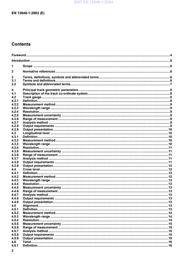 This EN specifies the requirements for homologation of track geometry quality parameters as measured by recording vehicles and by manually operated devices. The standard applies to all relevant track geometry parameters including track gauge, longitudinal level, alignment, cross-level (cant/superelevation) and twist. It does not however deal with conicity or railhead profile matters. It defines each parameter and specifies the requirements for measurement, the analysis methods and the presentation of results.