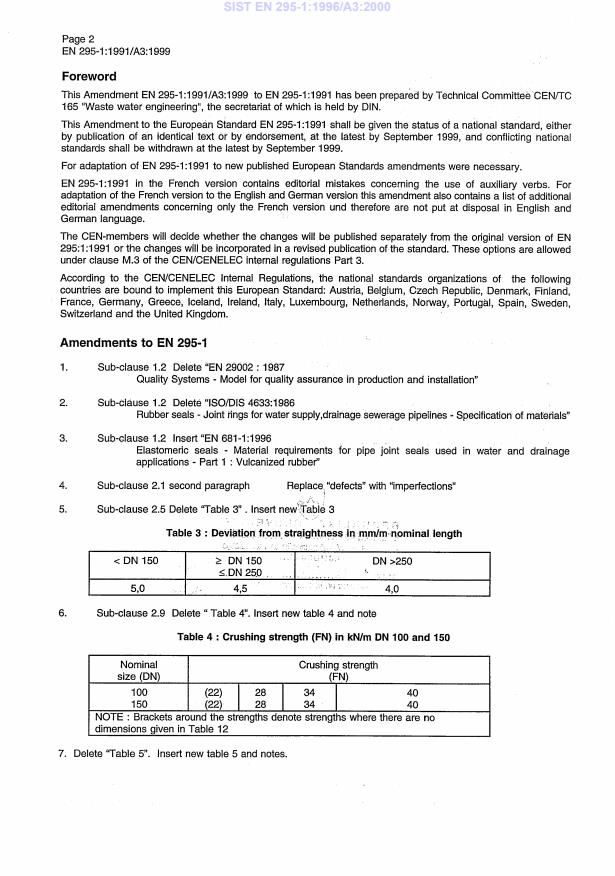 EN 295-1:1991/A3:1999 is a amendment published by the European Committee for Standardization (CEN). Its full title is "Vitrified clay pipes and fittings and pipe joints for drains and sewers - Part 1: Requirements". This standard covers: Vitrified clay pipes and fittings and pipe joints for drains and sewers - Part 5: Requirements for perforated vitrified clay pipes and fittings Amendment of EN 295-5:1994.