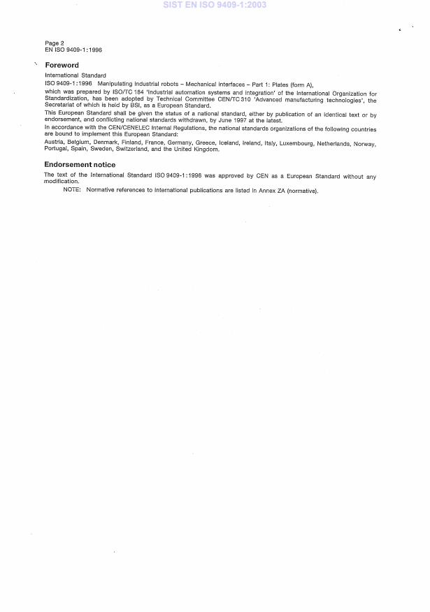 2003-01.Slovenski inštitut za standardizacijo. Razmnoževanje celote ali delov tega standarda ni dovoljeno.Industrieroboter - Mechanische Schnittstellen - Teil 1: Platten (Form A) (ISO 9409-1:1996)Robots manipulateurs industriels - Interfaces mécaniques - Partie 1: Interfaces a plateau (forme A) (ISO 9409-1:1996)Manipulating industrial robots - Mechanical interfaces - Part 1: Plates (form A) (ISO 9409-1: