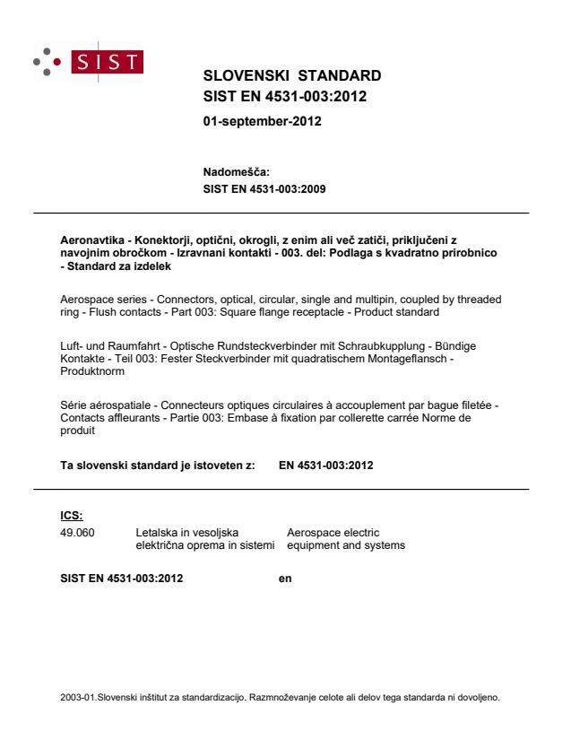 EN 4531-003:2012 is a CEN product standard in the aerospace series that defines the characteristics of square flange receptacles within the family of optical, circular connectors coupled by a triple start threaded ring (flush contacts). Prepared under ASD-STAN and approved by CEN, this standard specifies the physical, marking and designation requirements for mounted square-flange receptacles used in aerospace applications. It supersedes EN 4531-003:2007 and is intended for use across national standards bodies in Europe.