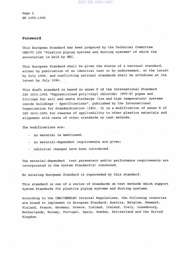 EN 1055:1996 has the following relationships with other standards: It is inter standard links to EN ISO 13257:2017, EN 1852-1:2009, EN 1519-1:1999, EN 16397-1:2014, EN 1566-1:1998, EN 1451-1:1998, EN 13598-1:2010, EN 13476-2:2007, EN 1455-1:1999, EN 1453-1:2000, EN 13476-3:2007+A1:2009. Understanding these relationships helps ensure you are using the most current and applicable version of the standard.