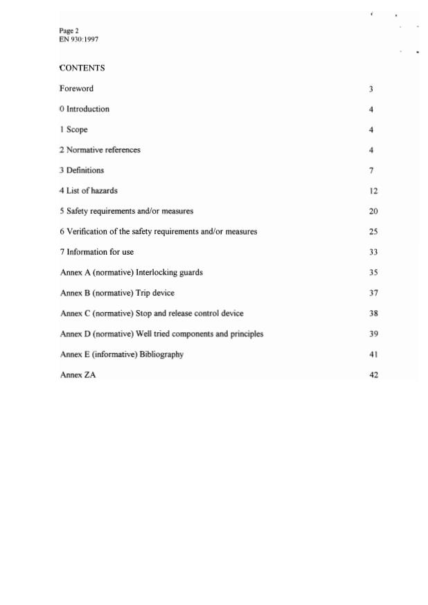 EN 930:1997 is a standard published by the European Committee for Standardization (CEN). Its full title is "Footwear, leather and imitation leather goods manufacturing machines - Roughing, scouring, polishing and trimming machines - Safety requirements". This standard covers: 1.1 This standard applies to the following machines which are intended to work material for the manufacture of footwear: - automatic and manual roughing, scouring and polishing machines - automatic and manual edge contour trimming machines 1.2 This standard does not apply to modular shoe repair machines. 1.3 This standard specifies safety requirements for design, construction and operation. It takes account of intended use, foreseeable misuse, component and system failure. 1.4 This standard covers all hazards relevant to the footwear, leather and imitation leather goods manufacturing industries. The use of machines within the scope of this standard in different industries may give rise to hazards which were not taken into account at the time of its preparation. 1.5 This standard applies to machines manufactured after its date of issue