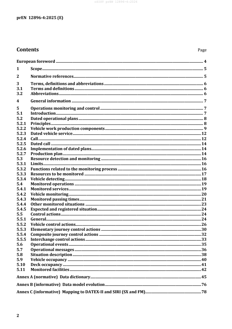 prEN 12896-4 is a draft published by the European Committee for Standardization (CEN). Its full title is "Public transport - Reference data model - Part 4: Operations monitoring and control". This standard covers: This document incorporates the following main data packages: - Dated Production Components; - Call; - Dated Call; - Production Plan; - Detecting & Monitoring; - Situation; - Messaging; - Control Action; - Operational Event & Incident; - Facility Monitoring & Availability; - Occupancy. It is composed of the following parts: - main document representing the data model for the concepts shared by the different domains covered by Transmodel (normative); - Annex A containing the data dictionary and attribute tables, i.e. the list of all the concepts presented in the main document together with their definitions (normative); - Annex B presenting the model evolution (informative); - Annex C detailing the mapping to DATEX-II and SIRI (informative). - Annex D, providing details of the significant technical changes between this document and EN 12896 4:2019 (informative).