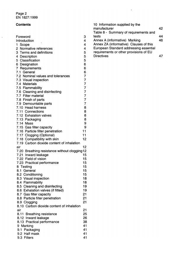 EN 1827:1999 is a standard published by the European Committee for Standardization (CEN). Its full title is "Respiratory protective devices - Half masks without inhalation valves and with separable filters to protect against gases or gases and particles or particles only - Requirements, testing, marking". This standard covers: This European Standard specifies performance requirements, test methods and marking requirements for half masks (re-usable) without inhalation valves and with separable filters (designed for a maximum of single shift use) to protect against gases or gases and particles or particles only. It does not cover devices designed for use in circumstances where there is or might be an oxygen deficiency (oxygen less than 17 % by volume) or for escape purposes. Laboratory and practical performance tests are included for the assessment of compliance with the requirements.