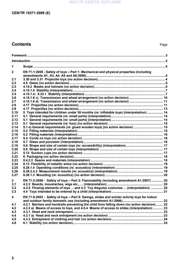 The purpose of this CEN Technical Report is to provide replies to requests for interpretations of EN 71-1:2005, Safety of toys – Part 1: Mechanical and physical properties (including amendments A1, A3, A4, A5 and A6:2008) EN 71-2:2006, Safety of toys – Part 2: Flammability (including amendment A1:2007) EN 71-8:2003, Safety of toys – Part 8: Swings, slides and similar activity toys for indoor and outdoor family domestic use (including amendment A1:2006)