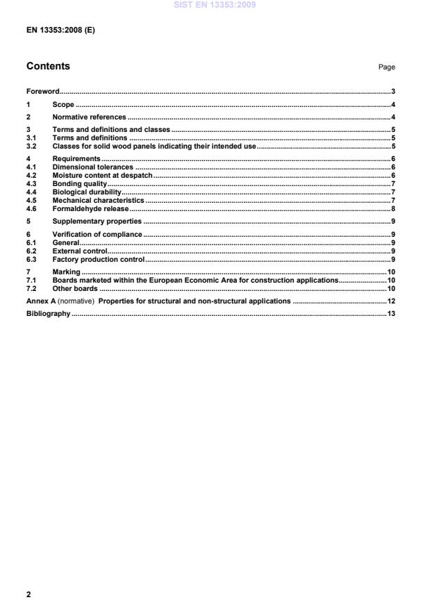 5 EN 12775, Solid wood panels — Classification and terminology EN 12871, Wood-based panels — Performance specifications and requirements for load bearing boards for use in floors, walls and roofs EN 13017-1, Solid wood panels — Classification by surface appearance — Part 1: Softwood EN 13017-2, Solid wood panels — Classification by surface appearance — Part 2: Hardwood EN 13183-2, Moisture content of a piece of sawn timber — Part 2: Estimation by electrical resistance method EN 13354, Solid wood panels — Bonding quality — Test method EN 13446, Wood-based panels — Determination of withdrawal capacity of fasteners EN 13986, Wood-based panels for use in construction — Characteristics, evaluation of conformity and marking EN 15416-3, Adhesives for load bearing timber structures other than phenolic and aminoplastic — Test methods — Part 3: Creep deformation test at cyclic climate conditions with specimens loaded in bending shear 3 Terms, definitions and classes 3.1 Terms and definitions For the purposes of this document, the terms and definitions given in EN 12775 and the following apply. 3.1.1 solid wood panel for use in dry conditions panel intended for use in interior applications with no risk of wetting as defined in service class 1 of EN 1995-1-1 and use class 1 of EN 335-2 NOTE Service class 1 is characterised by a moisture content of the material corresponding to a temperature of 20 °C and a relative humidity of the surrounding air exceeding 65 % for only a few weeks per year. 3.1.2 solid wood panel for use in humid conditions panel intended for use in protected external applications as defined in service class 2 of EN 1995-1-1 (e. g. behind cladding or under roof coverings) and use class 2 of EN 335-2 NOTE 1 It is also capable of resisting weather exposure for short periods (e.g. when exposed during construction). NOTE 2 Service class 2 is characterised by a moisture content of the material corresponding to a temperature of 20 °C and a relative humidity of the surrounding air exceeding 85 % for only a few weeks per year. 3.1.3 solid wood panel for use in exterior conditions panel intended for use in unprotected external applications as defined in service class 3 of EN 1995-1-1 and use class 3 of EN 335-2 NOTE 1 It is also capable of withstanding exposure to weathering conditions and liquid water, or water vapour in a damp but ventilated location where it can frequently attain a moisture content above 20 %. NOTE 2 Service class 3 is characterised by a moisture content of the material higher than service class 2. 3.2 Classes for solid wood panels indicating their intended use 3.2.1 Technical classes for non-structural use SWP/1 NS: Solid wood panel for non-structural use in dry conditions according to 3.1.1 SIST EN 13353:2009