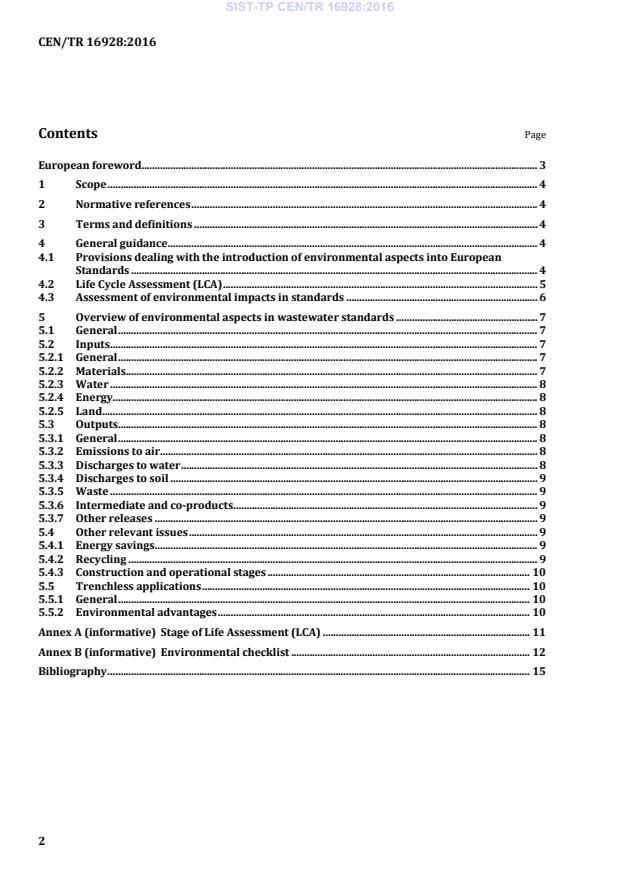 CEN/TR 16928:2016 is a technical report published by the European Committee for Standardization (CEN). Its full title is "Guidance for the implementation of environmental aspects in product standards and system standards in the field of wastewater engineering". This standard covers: This document applies for the implementation of environmental aspects in product standards and system standards in the field of wastewater engineering. It provides a structure on how to identify and consider environmental aspects and potential environmental impacts of products and systems in the field of wastewater engineering throughout their life cycle. NOTE Standards that are produced make environmental declarations voluntary where there are no national regulations. This is carried out by including for "No Performance Declared". This Technical Report gives guidance on how this life cycle should be considered in accordance with EN 15804. The stages of Life Cycle Assessment (LCA) are given in Annex A.