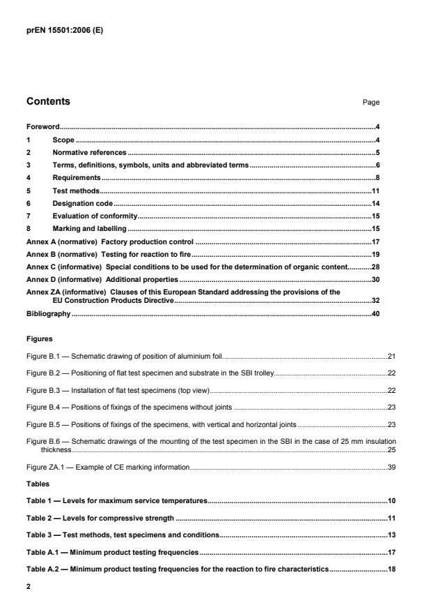 - Product characteristics and tests: Dimensional tolerances, thermal conductivity, apparent density, compressive and bending strength, dimensional stability, water vapour transmission, reaction to fire (see Annex B) and trace ion content. Test standards referenced include EN series and ISO methods (for example EN 1604, EN 13467, EN 13823, EN ISO 1716).