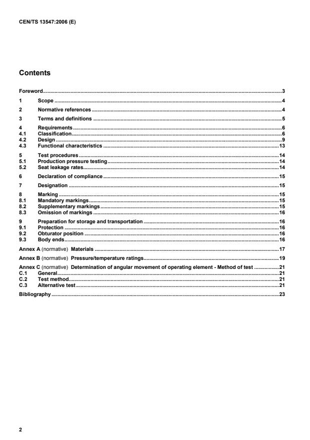 CEN/TS 13547:2006 is a technical specification published by the European Committee for Standardization (CEN). Its full title is "Industrial valves - Copper alloy ball valves". This standard covers: This document applies to copper alloy ball valves for general use having, flanged, threaded, capillary or compression or loose nut/union body ends. This document does not apply to copper alloy ball valves for drinking water applications. This document specifies the design and performance requirements including materials, pressure/temperature ratings for the shell and body seats, dimensions, test procedures and marking. For some specific fields of application, for example gas, valves to this document can be used provided the requirements of the relevant performance standards are met. Approval by the relevant regulatory body may be required. The range of nominal sizes is DN 6 to DN 300 and of nominal diameters 6 mm to 110 mm The range of pressure designations covered is PN 6 ; PN 10 ; PN 16 ; PN 20 ; PN 25 ; PN 32 ; PN 40 ; PN 63 ; Class 150 and Class 300. For the applicability of each nominal size/diameter and each pressure designation to the different types of valve end, see 4.1.
