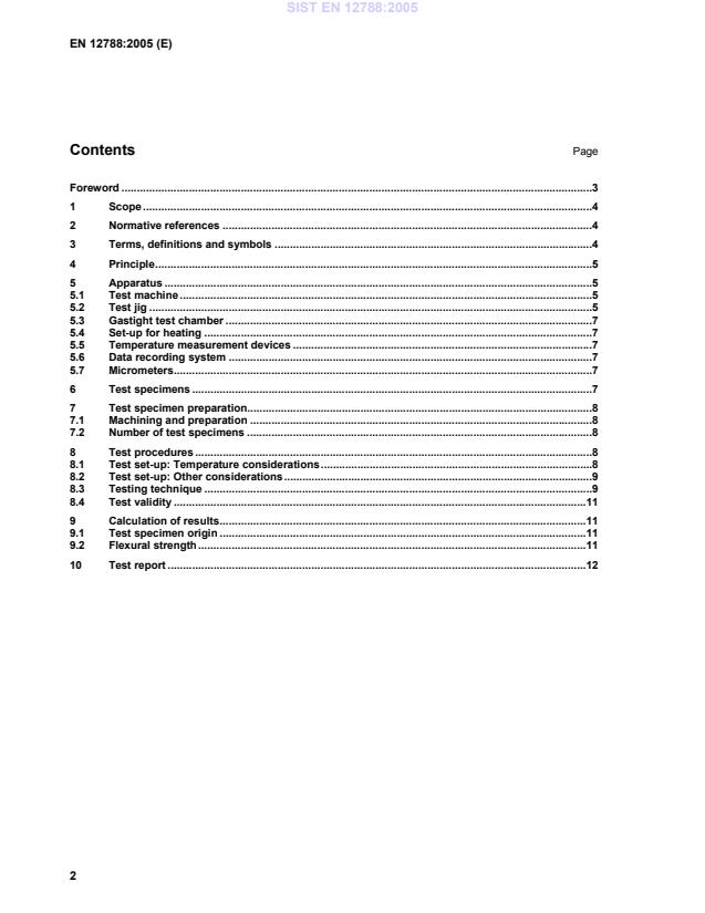 EN 12788:2005 is a standard published by the European Committee for Standardization (CEN). Its full title is "Advanced technical ceramics - Mechanical properties of ceramic composites at high temperature under inert atmosphere - Determination of flexural strength". This standard covers: TThis document specifies the conditions for determination of the flexural strength of ceramic matrix composite materials with continuous fibre reinforcement under three-point or four-point bending for temperatures up to 2 000 °C under vacuum or a gas atmosphere which is inert to the material under test. NOTE 1 The use of these environments is aimed at avoiding changes of the material affecting its flexural strength caused by chemical reaction with its environment during the test. This European document applies to all ceramic matrix composites with a continuous fibre reinforcement, unidirectional (1D), bidirectional (2D), and tridirectional (xD, with 2 < x £ 3), loaded along one principal axis of reinforcement. NOTE 2 The method outlined in this document should not be used to obtain values of flexural strength for design purposes.