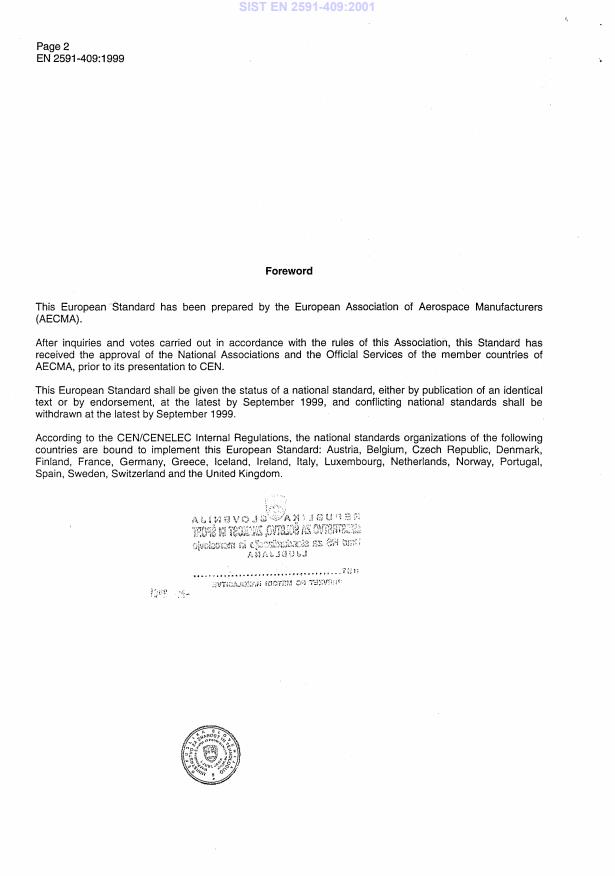 - EN 2591 (general series) - EN 2591-409:1999 is to be used together with EN 2591 for complete test and specification context.