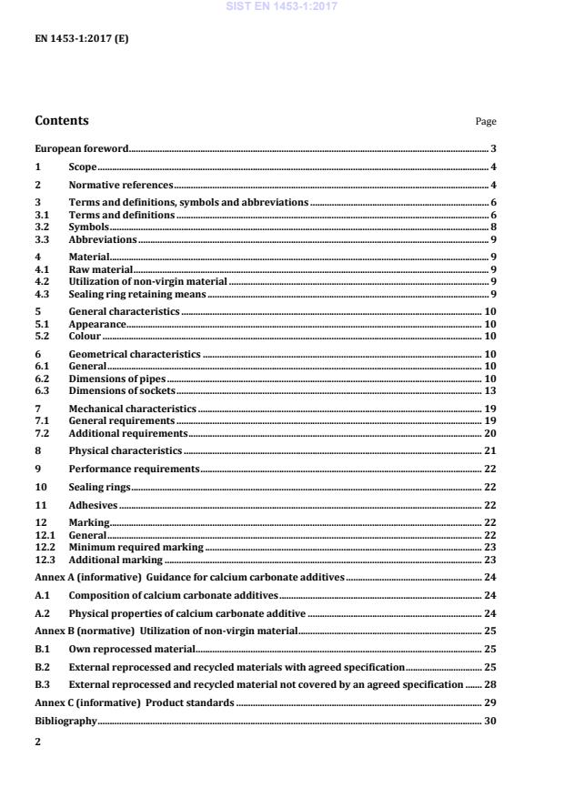 Contents Page European foreword . 3 1 Scope . 4 2 Normative references . 4 3 Terms and definitions, symbols and abbreviations . 6 3.1 Terms and definitions . 6 3.2 Symbols . 8 3.3 Abbreviations . 9 4 Material . 9 4.1 Raw material . 9 4.2 Utilization of non-virgin material . 9 4.3 Sealing ring retaining means . 9 5 General characteristics . 10 5.1 Appearance . 10 5.2 Colour . 10 6 Geometrical characteristics . 10 6.1 General . 10 6.2 Dimensions of pipes . 10 6.3 Dimensions of sockets . 13 7 Mechanical characteristics . 19 7.1 General requirements . 19 7.2 Additional requirements . 20 8 Physical characteristics . 21 9 Performance requirements . 22 10 Sealing rings . 22 11 Adhesives . 22 12 Marking . 22 12.1 General . 22 12.2 Minimum required marking . 23 12.3 Additional marking . 23 Annex A (informative)